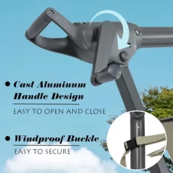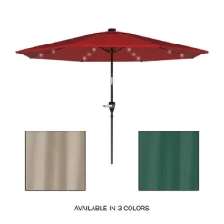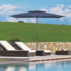 The Nassau 6.5-ft x 10-ft Rectangular Market Umbrella provides a smart and stylish way to shade your patio all summer long. Powered by solar energy, the 32 LED bulb lights will run for up to 4 hours when fully charged. This umbrella is designed for easy operation. Simply turn the crank handle until the canopy is completely open. The durable anodized-aluminum, rust-resistant pole with the convenient push-to-tilt feature has a rich bronze-colored finish. The 6-rib canopy, covered in weather and fade-resistant Breez-Tex™ fabric, sports a single wind vent that allows air to escape freely and limits wind damage. The Nassau Market Umbrella is backed with a 3-year Breez-Tex™ canopy warranty and a 1-year warranty on the pole and structure. Base sold separately.