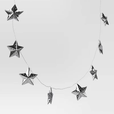 Add a touch of twinkle to your holiday decor with this 10-Count LED Battery Operated Silver Star Christmas Novelty String Lights from Wondershop™. These Christmas string lights features a long clear wire that suspends metallic silver star accents with 10 warm white LED bulbs to cast a cozy festive glow. The seasonal lighting accessory is ideal for both indoor and outdoor use, and you can drape it on your front door, balcony railing or your backyard space to create versatile displays.
