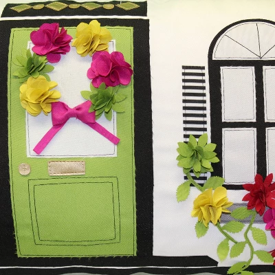 - Each throw pillow showcases unique dimensional flowers, subtle metallic accents, delicate applique and adorable black and white piped edges