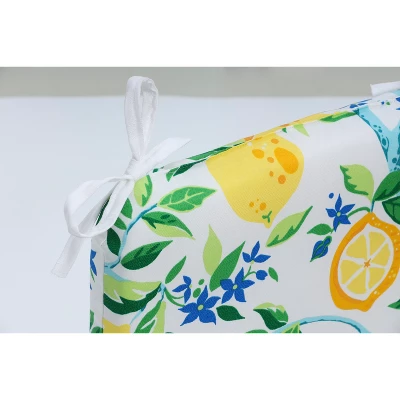 The lemon tree pattern of this set of two outdoor seat cushions gives a warm and carefree vibe of summer. Bright yellow lemons with vivid green leaves pop off the crisp, white ground. Additional features of these outdoor seat cushions include rounded corners, 14″ ties and recycled polyester fill with sewn seam closures. Also suitable for indoor use.