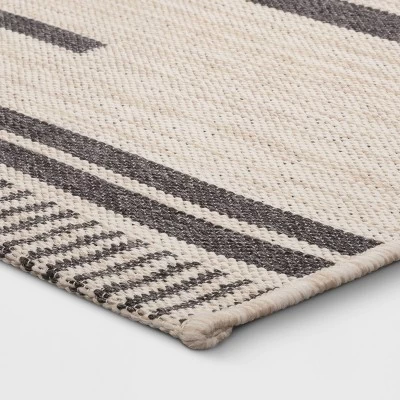 Adds warmth and style to your gathering area with this Multi-Tier Bars Outdoor Rug from Project 62™. Featuring black multi-tier bars on a subtle backdrop in a neutral tone, this outdoor area rug adds comfort underfoot while blending in easily with your existing decor. Its construction and spray latex backing make it a great addition to higher-traffic areas, and you can simply hose clean with water for ease of maintenance.
