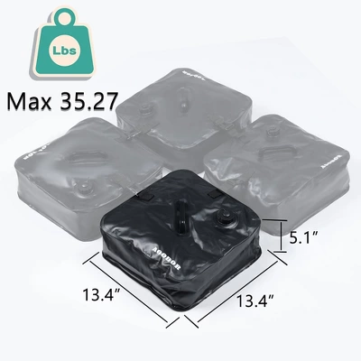 - Item dimension – 13.4”(L) x 13.4(W)’’ x 5.1’’(H) of each bag, per piece can hold up to 35lbs of water. Cross bar base is not included.
