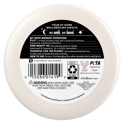 A tranquil, restful blend of jojoba, cedarwood and chamomile, our relaxing Love & Rest scented vegan candle is made with ethically sourced oils and extracts for a calming and rejuvenating at-home spa experience. Infused with 3x the essential oils and made with a soy wax blend, this scented candle provides a clean and consistent burn time of up to 30 hours. Our scented candles are also PETA approved and vegan, cruelty-free, dye-free and packaged in a recyclable glass jar. Love Beauty and Planet is committed to small acts of love that make you and our planet a little more beautiful, every day. What’s the best way to use this fragrant, feel-good candle? Trim the wick to 1/4 inch before lighting. Place the candle on a heat-resistance surface, carefully light the wick, and then let the fragrance fill the room! A small act of love for you and the planet. Love this scent? Explore our whole range of Beloved by Love Beauty and Planet Scented Candles, infused with signature ingredients. This scented candle is best paired with the complete Love & Rest collection for an immersive sensory experience for bath and body. We are starting a beautiful movement. Are you in?
