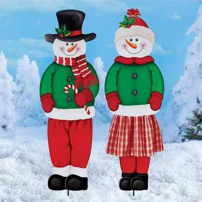 Dressed in bright holiday colors, these festive snowman stakes are the perfect addition to your outdoor holiday décor. Each smiling snowman wears a colorful outfit in red and green with holly accents. The stakes are easy to anchor anywhere in your yard or garden. Easy assembly req. Metal. Each is approx. 8 3/4″L x 32″H. Choose: Boy or Girl.