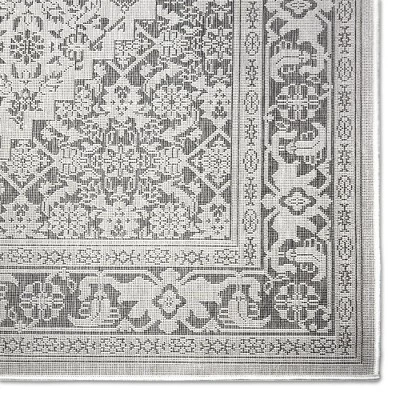 - TRADITIONAL DESIGN: The Nicole Miller Patio Country Dahlia rug collection features a timeless design for three-season spaces in your home, with a beautiful, traditional medallion motif framed by a matching border in black and gray.