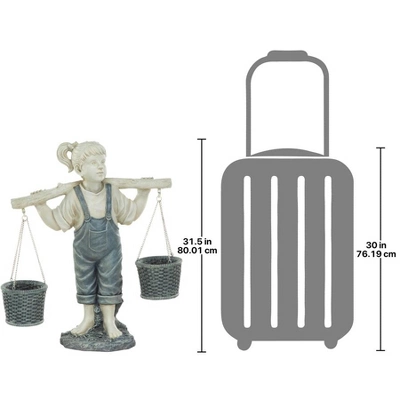 We bet you love flowers as much as Felicity does! Balancing two faux woven baskets hanging from metal chains and ready for your favorite posies, this lovingly crafted sculpture boasts rich details, from the buttons proudly popping off her overalls to her bouncy, beribboned pigtails. A joyful childhood memory frozen in time, this helping of happiness is cast in quality designer resin and finished in two-tone finish to highlight details from dimpled fingers to sweet curls. This timeless Design Toscano focal point statue will become a treasured heirloom for home or garden yard. Simple assembly required. 25½”Wx11½”Dx31½”H. 20 lbs.
