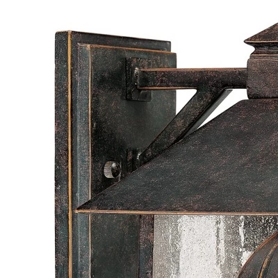 Bring the charm of a country garden to your porch or patio with this outdoor wall light from Franklin Iron Works. This lantern-style fixture comes in a bronze finish frame with seeded glass panels for a lovely old-fashioned look. A scrolling leaf-and-vine pattern runs across the sides for a beautiful decorative accent.