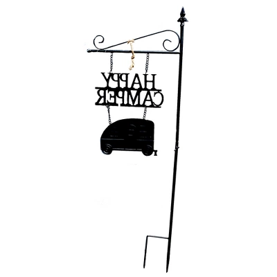 A Black Decorative L-Shaped Sign Holder Containing A Hanging Sign Of A White Travel Camper With A Brown Door And Blue Windows Attached By A Black Chain. Above The Camper Attached By A Black Chain Is A Laser Cut Letter Sign Spelling Out “Happy Camper”.. New. Measurements 32.0 In H X 13.0 In W X .5 In D. . Made Of Metal. Outdoor Use Only. Imported