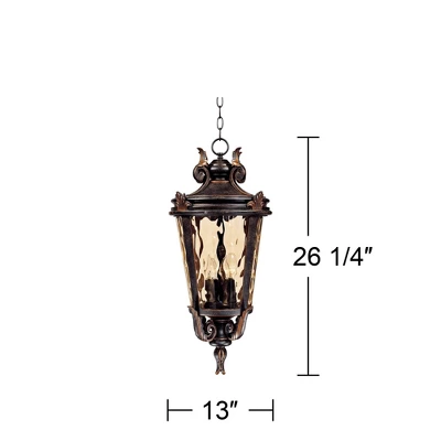 Named after the beautiful port city in France, this Casa Marseille outdoor hanging light features striking Mediterranean styling. It comes in a bronze finish die-cast metal frame decorated with elaborate scrolling and acanthus leaf details. Champagne water glass adds a wavy, eye-catching effect. This light is damp location rated for use only in covered porches or patios, and is also great for indoor use.
