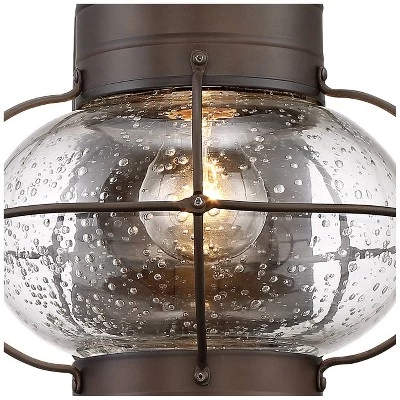 - Oil rubber bronze finis. Steel construction. Clear seedy glass. Wet location rated for outdoor use. Dusk to dawn manual override option available.