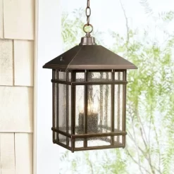 - Outdoor hanging porch light from the Sierra Craftsman Collection by Kathy Ireland Home. Rubbed bronze finish. Sturdy die-cast metal construction. Decorative frosted seeded glass panels.