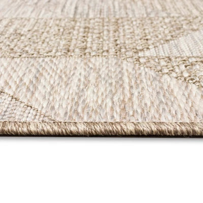 The Angles rug features a diagonal collage of textures adding a rustic textural look to any space, indoor or outdoor. Made in Egypt from 100% polypropylene, the multi textural effects of the Orly Collection distinguishes this casual power loomed collection. The contrasting textures with an array of motifs featuring braids, twills, crosshatch and boucle that are rich in dimension creating intricate designs in natural tones with a high-quality finish. The material is flatwoven, low profile, weather resistant, UV stabilized for enhanced fade resistance, durable and ideal for those high traffic areas such as your patio, sunroom, kitchen, entryway, hallway, living room and bedroom making this the ideal indoor or outdoor rug. The artisan crafted patterns are offered in an eclectic mix of textures ranging from contemporary to traditional designs; making these perfect accent rugs for your home. Limiting exposure to rain, moisture and direct sun will prolong rug life.