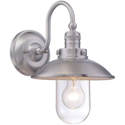 This traditional outdoor wall light features a simple metal shade, round wall plate and curved arm in light brushed aluminum finish. The clear glass tube that covers the light enhances the industrial inspirations of this classic exterior design. A beautiful addition to your home from Minka lighting.