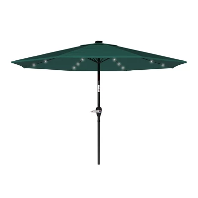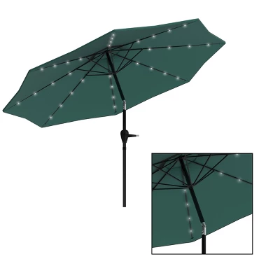 Create a cool and comfortable spot to entertain guests under an attractive piece of outdoor décor that provides quality sun protection with this 10-Foot LED Light Patio Canopy by Pure Garden. The easy-to-use hand-crank opens and closes the umbrella in seconds to block sunlight so you can relax in the shade during hot summer days. Use the convenient push button tilt feature to adjust the vertical angle of the pool umbrella in several positions, providing UV 30+ protection wherever the sun is shining. In addition, this umbrella includes 32 LED lights powered by a rechargeable battery pack and solar panel at the top of the steel pole with an on/off switch that allows you to use the lights as needed. Simply crank the pool umbrella closed when not in use and secure it to the pole with the built-in strap.