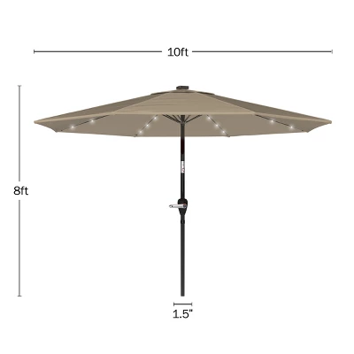 Enjoy your outdoor space, day, or night with the Solar Powered LED Patio Umbrella by Pure Garden. The canopy of this sunshade has a 10-foot diameter and features a vent to allow for air circulation to keep you cool in the heat. The canopy is also made of fade-resistant and water-repellent polyester, ensuring it will stay beautiful season after season. Made of durable steel, the umbrella’s pole and 8 canopy ribs all have an attractive dark bronze powder-coat paint that helps protect against rust, corrosion, and abrasion. The support pole has an easy, push-button tilt function and a crank for smooth operation of the shade. Each of the 8 steel canopy ribs has 4 LED lights that provide a relaxing ambiance and are powered by the built-in solar panel and rechargeable battery pack. The lights, when fully charged, provide light for up to 8 hours!