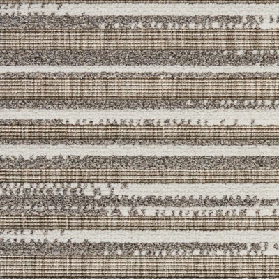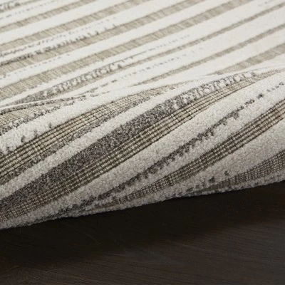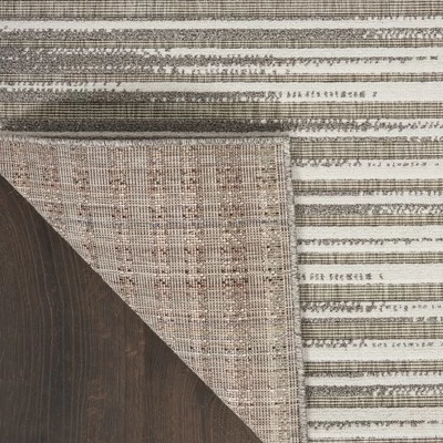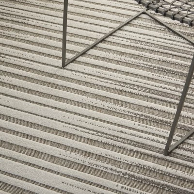 The subtle, shape-shifting stripes of this Calobra design bring a fresh, contemporary look to your indoor or outdoor space. This versatile area rug looks as good in your favorite room as it does on a patio, porch or pool deck. Elegant with the special touch of cut-and-loop pile in an easy-care poly-fiber blend. Rinse with hose, air-dry both sides. To extend the life of your outdoor rug, bring indoors during extreme weather.