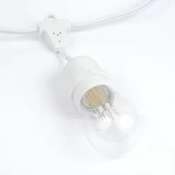 Novelty Lights clear S14 medium base bulbs string light set with 25 bulbs on 37.5′ of commerical grade white wire. These are our most durable string light sets and are suitable for year round outdoor use and permanent lighting applications. Each set includes 25 S14 medium base bulbs on a commerical grade white wire stringer with 25 sockets that are spaced 18″ apart. These clear S14 light strings have long-lasting 6,000 hour bulbs and are on a heavy duty 16 gauge SPT-2 white wire stringer. Each socket is made with PVC plastic to provide a water-tight seal and to ensure no defects due to weather. These durable and heavy duty light strings will provide you with years of maintenance free use. Perfect to use on any patio, restaurant, backyard, pergola, wedding venue, or town square for hanging outdoor string lights.