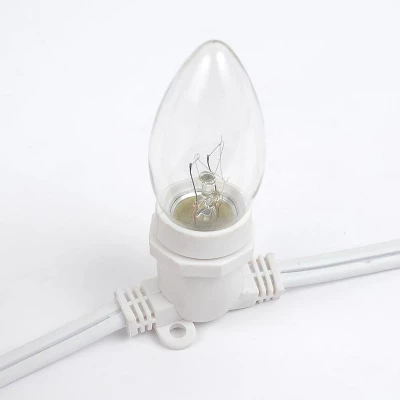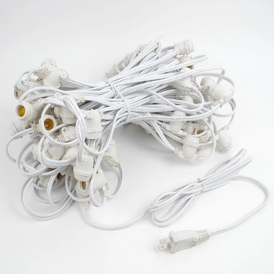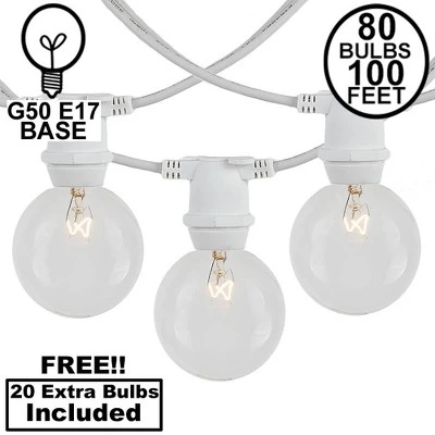 Novelty Lights clear G50 intermediate base bulbs string light set with 80 bulbs on 80′ of commerical grade white wire. These are our most durable string light sets and are suitable for year round outdoor use and permanent lighting applications. Each set includes 80 G50 intermediate base bulbs on a commerical grade white wire stringer with 80 sockets that are spaced 15″ apart. These clear G50 light strings have long-lasting 3,000 hour bulbs and are on a heavy duty 16 gauge SPT-2 white wire stringer. Each socket is made with PVC plastic to provide a water-tight seal and to ensure no defects due to weather. These durable and heavy duty light strings will provide you with years of maintenance free use. Perfect to use on any patio, restaurant, backyard, pergola, wedding venue, or town square for hanging outdoor string lights.