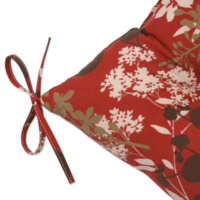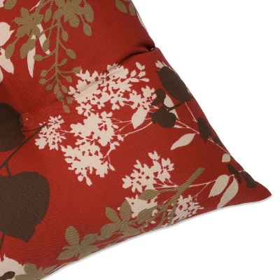 Silhouettes of flowers captivate attention in the lovely print design of this set of two outdoor tufted chair cushions. In an attractive floral pattern, flowers and leaves in shades of brown, beige and peach are set on a red ground. Additional features of these outdoor tufted chair cushions include 14″ ties and recycled polyester fiber fill with sewn seam closures. Also suitable for indoor use.