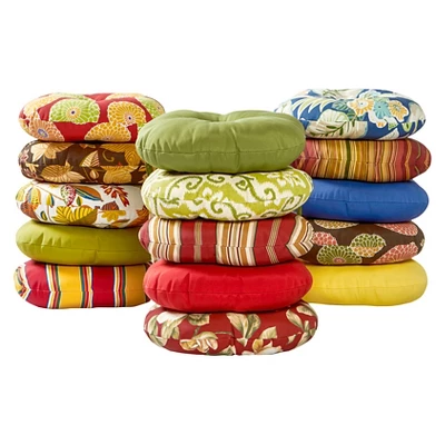 Add a bit of comfort and style to your outdoor bistro set with these Bistro Cushions from Kensington Garden. Cushions feature a center circle tack which prevents fill from shifting and bunching, and two string ties to keep cushions securely attached to chairs. Each set includes two 15 inch round chair cushions made from 100% polyester fabric that is fade, stain and water resistant. The cushion’s soft poly-fiber fill is made from 100% recycled, post-consumer plastic bottles, and overstuffed for added comfort, strength and durability. A variety of colors and prints are available to enhance your outdoor decor.