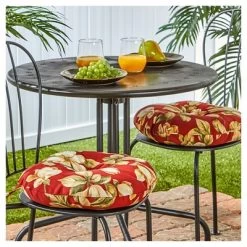 Add a bit of comfort and style to your outdoor bistro set with these Bistro Cushions from Kensington Garden. Cushions feature a center circle tack which prevents fill from shifting and bunching, and two string ties to keep cushions securely attached to chairs. Each set includes two 15 inch round chair cushions made from 100% polyester fabric that is fade, stain and water resistant. The cushion’s soft poly-fiber fill is made from 100% recycled, post-consumer plastic bottles, and overstuffed for added comfort, strength and durability. A variety of colors and prints are available to enhance your outdoor decor.