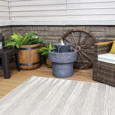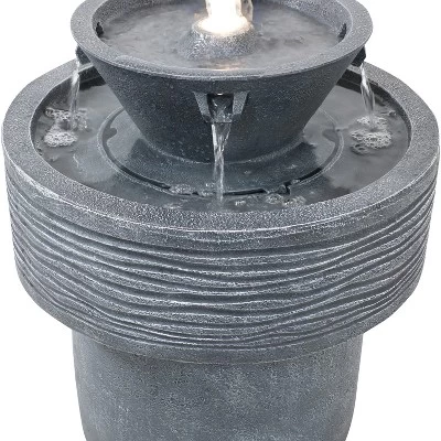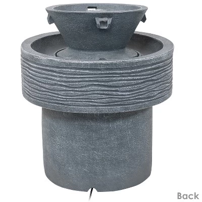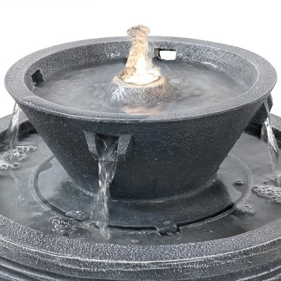 This tranquil streams water fountain with LED lights will add contemporary charm and old-country elegance to the garden, patio, deck, yard, or other outdoor space. The resin construction is designed for weather resistance while the neutral gray finish will complement many different decoration schemes. This fountain is also lightweight enough to move around from place to place easily. The flowing water streams will emit instant soothing energy as the water bubbles up through the top of the fountain and streams down the 4 spouts to the lower basin in beautiful, small waterfalls that add gorgeous visual elements. Water will then circulate through the submersible electric pump located in the center housing. No plumbing is necessary for operating the fountain. Simply place the fountain wherever desire, fill the bottom basin with water, plug it into a standard outdoor electrical outlet when it is ready to run, and enjoy your new fountain feature.