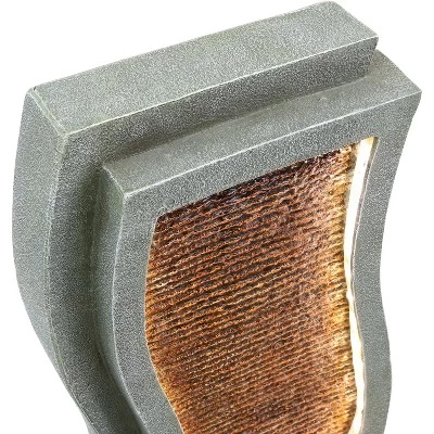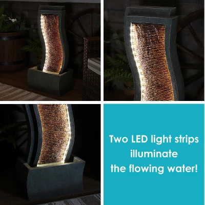 Add a beautiful and calming, modern styled water feature to your lawn, patio, yard, garden, or other landscaping area with this contemporary curves, resin, outdoor water fountain featuring LED lights. This durable exterior water feature is constructed of resin that can easily withstand the elements outdoors yet is also lightweight and much easier to move around than a traditional stone fountain. The water falls down the front face of this tower fountain over ridged edges for added visual detail and style. The interior of the textured column features two LED light strips that beautifully illuminate the water flowing down the face of the fountain at night. And, no complicated plumbing or installation is required with the included electric submersible pump that continuously recirculates the water for easy flow all day and night. This fountain also has an adjustable water flow feature so you can adjust the rate the water falls to any desired rate.