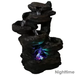 Make any office, living room, bedroom, or other personal space a little more peaceful and tranquil with this indoor tabletop fountain. Durably constructed of easy-to-maintain polyresin, this fountain features the attractive look and feel of real wood but is easy to clean. Promote relaxation in the home or office with this easy-to-assemble fountain that doesn’t require any complicated plumbing or installation with the included, electric submersible pump that stays quiet so that the water soundscapes can expand. The cascading water goes down into the bottom tier where it is circulated back up to the top so the water can continuously fall through the divots in each layer. The bottom basin features a built-in LED light that illuminates the flowing water, making this a great piece of decor to enjoy in the evening when the sun goes down.