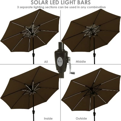 • SOLAR POWERED LIGHTS TO BRIGHTEN THE NIGHT: Outdoor umbrella with lights will run 3 to 4 hours on a full charge; LED lights feature 2400 MCD brightness with Kelvin color temperature of 4000K
