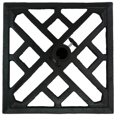 Make sure your patio umbrella stays firmly secured, even in harsh, windy conditions with this decorative patio umbrella base. This outdoor accessory is constructed of strong and durable cast iron that is incredibly weather-resistant and heavy, ensuring long-lasting use and durability for years to come. The heavier properties of this base will keep the umbrella upright and ensure that it will not tip over, even in windy conditions. Featuring a thumb screw, this base can accommodate umbrellas with 1.25- to 2-inch diameter poles. The intricate geometric design adds a stylish element to this functional piece of outdoor decor, sure to complement any modern or contemporary aesthetic outdoors. This cast iron, patio umbrella base measures 17 inches in diameter and 13.5 inches tall to accommodate most patio umbrellas and patio spaces. Even fit this base between any patio table (please note, a table is not included) with ease and stay cool in the shade.