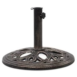 This umbrella base is flower design, coppery color, elegant and the classic. The material of this product is iron, heavy duty, and would not make the umbrella tilt. Do not hesitate to buy it now!