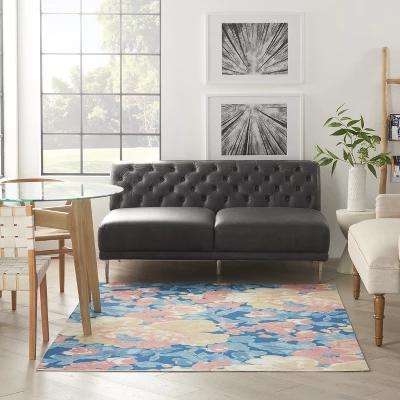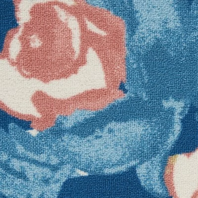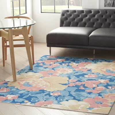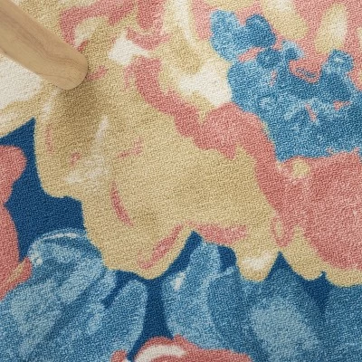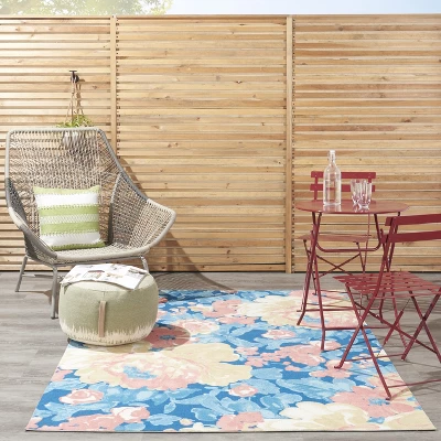 Like a lush botanical garden, the floral pattern of this Waverly Sun N’ Shade indoor/outdoor rug bloom vibrantly on a field of deep blue. Machine made of polyester fibers specially designed to withstand the elements, it brings an artistic ambiance to indoor and outdoor spaces alike.