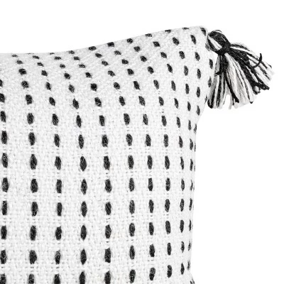 - Plain woven base with dash patterned strips accented with corner tassels.